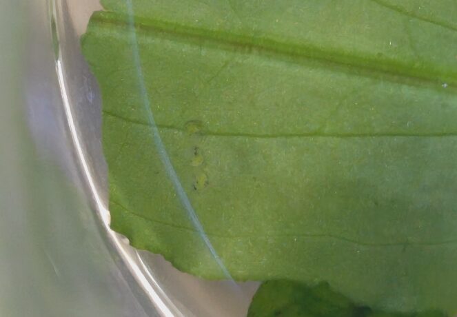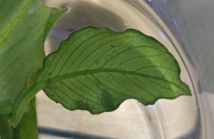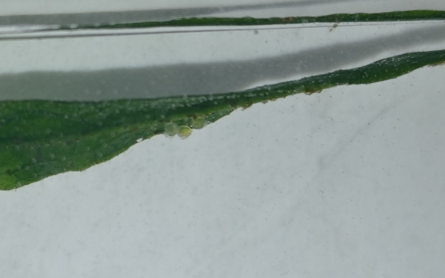 意外と細い葉の裏にも産みつけることがあるようで、確認した中でも「ミクロソリウム・ナローリーフ」程度の葉幅でも産みつけていました。